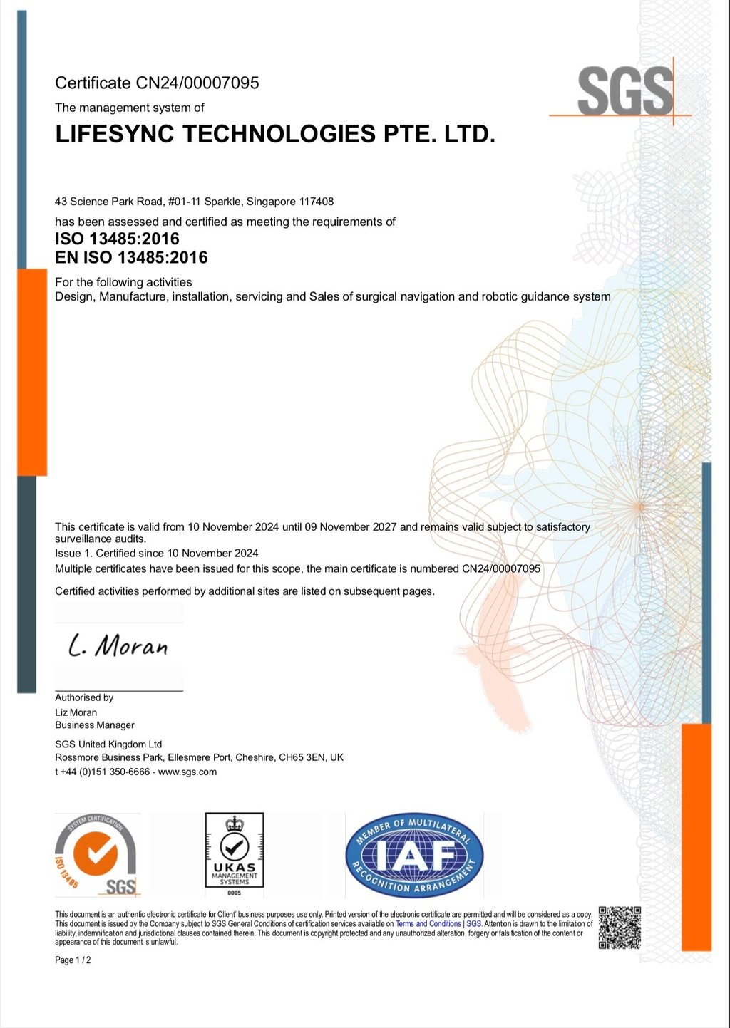 SINGAPORE, October 28, 2024 -- LifeSync Robotics is pleased to announce that the company has been awarded ISO 13485:2016 certification for Design, Manufacture and Sales of Surgical Navigation and Robotic Guidance System by SGS, demonstrating its adherence with the most rigorous global regulatory and quality standards. ISO 13485 is the harmonized standard for quality management systems in the design and manufacture of medical devices. It outlines specific requirements that help organizations ensure their medical devices meet both customer and regulatory demands for safety and efficacy.