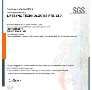 LifeSync Robotics has been awarded ISO 13485:2016 certification for Design, Manufacture and Sales of Surgical Navigation and Robotic Guidance System by SGS, demonstrating its adherence with the most rigorous global regulatory and quality standards.